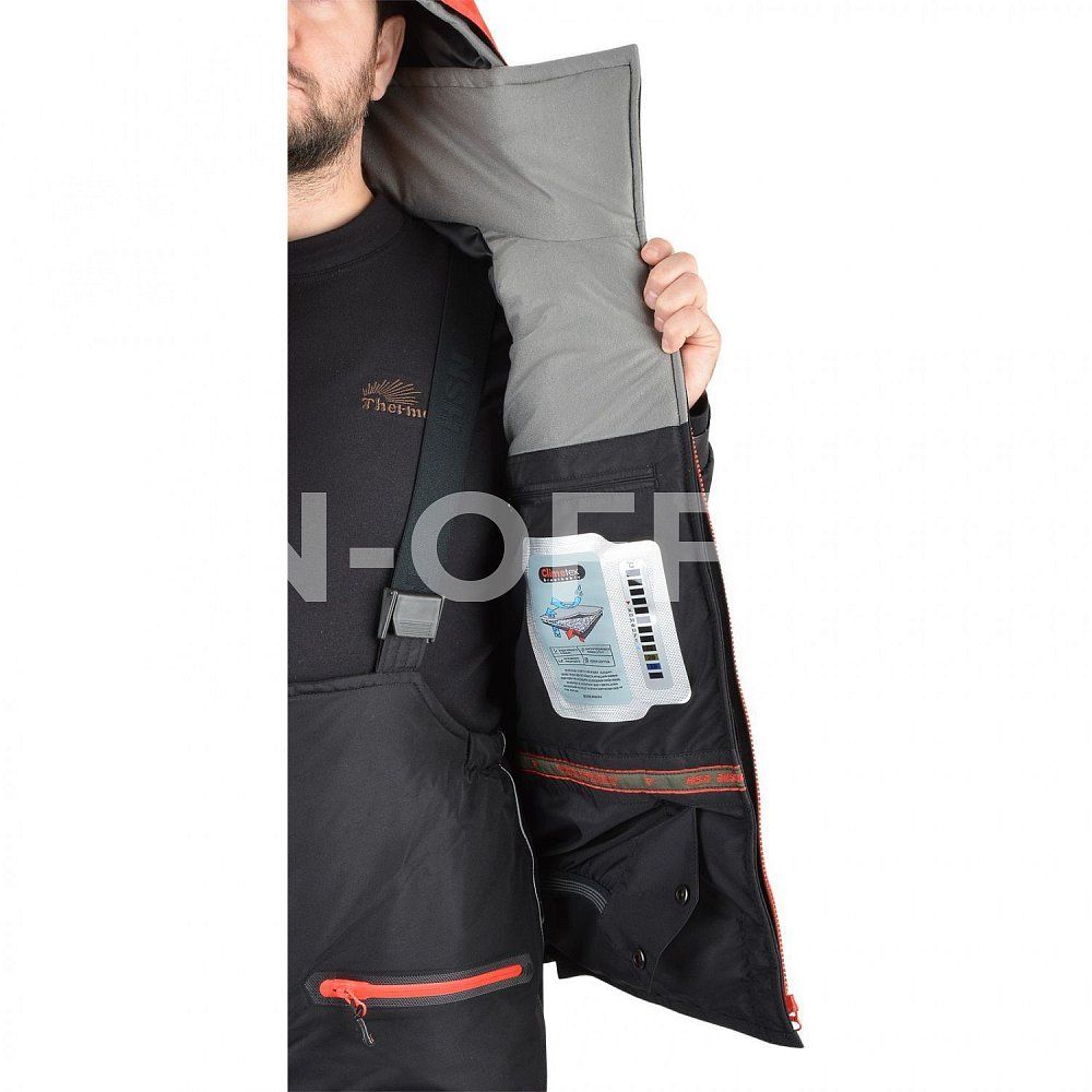 - внутри куртки три кармана с датчиком внутренней температуры: 2 кармана с молниями и объемный карман из сетки;