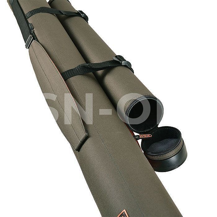 Сделан из пластмассовой трубы, обтянутой тканью Oxford(водостойкая). Внутри и по бокам обклеена ППУ 2 мм. Один конец закрыт специальной заглушкой, другой - на молнии. На донышке есть вставка из паралона для защиты. Для более удобного переноса в конструкции тубуса предусмотрен ремень на плечо и ручка. Есть один большой карман. В тубусе одновременно могут поместиться несколько спиннингов.